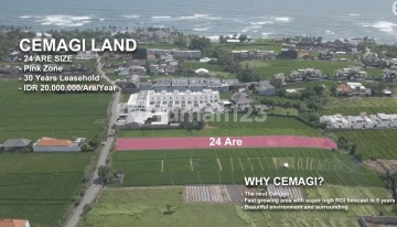 **Description** Discover a rare investment opportunity with this 24-are land in Cemagi, Bali. Located just 400 meters from Cemagi Beach, this pink zone property offers breathtaking ocean views and is ideal for luxury villa developments or commercial projects. It comes with a 30-year leasehold and an extension option for long-term value. **Location:** Cemagi Beach, Bali Only 400m to the beach **Property Features:** - Land Size: 24 Are - Zoning: Pink Zone - View: Ocean views - Proximity: Close to Cemagi Beach **Price:** - IDR 20 Million/Are/Year - USD $1,275/Are/Year **Leasehold Details:** - 30-Year Leasehold - Extension option available **Investment Benefits:** - **Prime Location:** High-demand area near Cemagi Beach, perfect for premium developments. - **Ocean Views:** Enhances appeal and value for potential buyers or renters. - **Flexible Development Options:** Suitable for luxury villas or boutique resorts. - **Rapid Growth Area:** Cemagi is seeing rising demand and increasing property values. Seize this strategic location with unmatched ocean views. Contact us today to secure this exclusive plot in Cemagi!