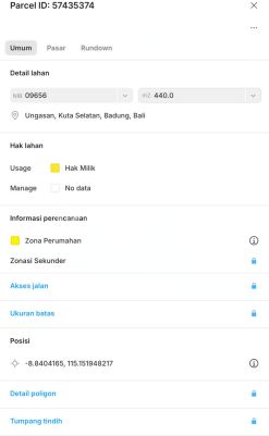 LAND FOR SALE MAIN OCEAN VIEW STREET STARFRUIT SARI STREET NEAR SAVAYA AND MELASTI BEACH DETAILS: - Land area 440 m2 (4.4 Are) - Residential Yellow Zone - Front width 18 meters - Hook-shaped land position (2 road accesses) - Located on the main road, suitable for restaurant, villa, cafe, minimart, etc. businesses - SHM (Freehold Title) - Electricity, water, internet access available PRICE 700,000,000 / Are Dn58