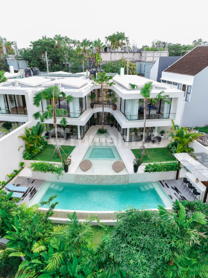 FOR SALE - UMALAS,BALI. BRAND NEW LUXURY TROPICAL 4BR VILLA Discover unparalleled luxury in this upcoming minimalist modern villa nestled in the serene heart of Umalas. This will be your perfect holiday home in Bali. 4-bedroom masterpiece spans across a sprawling 575 square meters of lush landscapes, where a harmonious blend of modern aesthetics and superior building materials creates an atmosphere of enduring opulence. Step into the 380 square meters of meticulously designed living space, where every detail has been crafted to perfection. From the spacious living areas to the private cinema room, from the chic kitchen and dining area to the indulgent jacuzzi and garden, this villa offers a life of sophistication and ease. Details: Land size : 575m2 Building size : 380m2 2 Storey Bulding SHM ( Freehold ) + Building permit (PBG-SLF) 2025 4 Bedrooms ensuite ( 2 master bedroom facing to the pool ) Staff area ( 1 Bedroom + 1 Bathroom ) Sunken Living room Private Cinema room 1 Powder room Dry & wet Kitchen + Island table Dining area with 8 seater Jacuzzi Swimming pool Mini bar Carport for 2 car 4,5 meters road acces Fully furnished 5 minutes to LIGA TENNIS PADEL Umalas 10 minutes to Pantai Batu Belig & Cafe del Mar 12 minutes to Atlas Beach Club 12 minutes to Pantai Berawa Canggu 45 minutes to Airport Ngurah Rai Price : IDR 21.5 Billion - Negotiable #UVF76