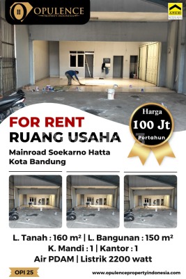 For Rent Commercial Space on Soekarno Hatta Main Road Floor Area: 160 sqm Land Area: 150 sqm (7.5m x 20m) Office: 1 Toilet: 1 PDAM Water Supply Electricity: 2200 VA Monthly Rent: 100 Million IDR Opi 25 Albert Opulence 08122223xxxx