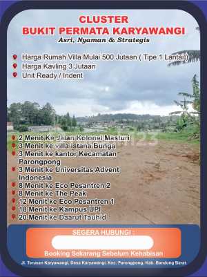 PLOTS AND READY-TO-BUILD HOUSES IN BUKIT PERMATA KARYAWANGI CLUSTER, Jl. TERUSAN KARYAWANGI, KEC. PARONGPONG, KAB. BANDUNG BARAT ✅️ ➡️ PROMO PRICE FOR PLOTS STARTS FROM 2.5 MILLION NETT ✅️ (Specific units). A. STRATEGIC LOCATION: ✅️ Cool location; ✅️ Altitude of 1,269 meters above sea level; ✅️ Location close to economic, tourism, and education centers: 1. 2 minutes to Jalan Kolonel Masturi; 2. 3 minutes to Villa Istana Bunga; 3. 3 minutes to Parongpong District Office; 4. 3 minutes to Adventist University of Indonesia; 5. 8 minutes to Eco Pesantren 2; 6. 8 minutes to The Peak; 7. 12 minutes to Eco Pesantren 1; 8. 18 minutes to UPI Campus; 9. 20 minutes to Daarut Tauhiid. B. TYPE AND LEGALITY: ✅️ Plot sizes vary starting from 65 m2; ✅️ NORMAL PRICE for plots is 3.5 million/m2; ✅️ PROMO PRICE for plots is 2.5 million/m2 for Plots Number 02, 03, and 04; ✅️ Payment schemes: cash and 6X installment cash (60% down payment); ✅️ INDENT HOUSE PRICE STARTS FROM 300 MILLION NETT. ️️ NOTE: Prices are effective from January 1, 2026; PROMO PERIOD is valid until March 31, 2026 (as long as promo units are available); For interested partners in marketing, fee is 3%; For more information: 0811204xxxx.