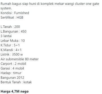 For Sale Rumah bagus siap huni di komplek mekar wangi cluster one gate system. Kondisi : Furnished Sertifikat : HGB L.Tanah : 200 L.Bangunan : 450 3 lantai Lebar Muka : 10 K.Tidur : 5+1 K.Mandi : 4+1 Listrik : 3500 w Air submersible 80 meter Carport : 2 mobil Garasi : 4 mobil Hadap : timur Bangunan 2012 Bentuk Tanah : kotak Harga 4,7M nego #YOH