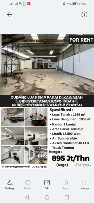 Warehouse in Taman Kopo Indah. Acquire this modern warehouse for rent, offering a complete facility environment, perfect for those seeking a secure residence. Main Property Specifications: - Bathrooms: 3 - Certificate: - - Furniture Condition: Unfurnished Key Features: - Ready to Occupy. - Flood-Free. - Close to Toll Access. Located in Taman Kopo Indah, this warehouse provides easy access to various attractive facilities. For a price of Rp. 74,583,333, you can own the best residence that is ready to occupy. Seize the opportunity to enjoy the comfortable living experience in the Taman Kopo Indah area! Contact immediately for further information!