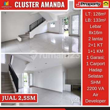 For Sale: CLUSTER AMANDA SUMMARECON BANDUNG Land Area: 128m² Building Area: 133m² Dimensions: 8x16m 2 Floors 2+1 Bedrooms 1+1 Bathrooms 1 Garage + 1 Carport South Facing Freehold Title (SHM) 2200 Watt Water Supply by Developer PRICE: 2.55M Ready for Immediate Occupancy (YDS)