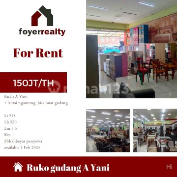 Disewakan Ruko di Jalan Ahmad Yani - Bandung : Bisa digunakan untuk Gudang LT. 578 meter LB. 520 meter Lebar muka 5,5 meter 1 kamar mandi 1 lantai ngeblong PBB : Penyewa Harga Sewa : 150 Jt/Th Nego Susan Foyer 0838 211 xxx 17 0812 2107 5xxx HI