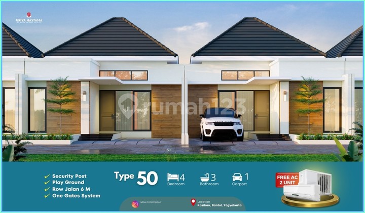 Affordable Minimalist House in Jogja Type 50 with Modern Design Experience the comfort of living in a modern minimalist-style home with an elegant, functional design and abundant natural light. Located in a secure and private one-gate system cluster, this residence offers tranquility and prestige for your family. An ideal place to build beautiful stories with your family. Specifications: - Building Type 40m2 - 70m2 - Land Area 72m2 - 120m2 - Bedrooms: 2 - Bathrooms: 1 - Living Room - Family Room - Dining Room - Kitchen - Drying Area - Terrace - Front Garden - Carport: 1 car - Water Source: PDAM (Municipal Water) - Electricity: 1300 watt Advantages: - Post Security - Garden - 6m Road Row - One Gate System Strategic Location: - 3 Minutes to SMP Kasihan - 3 Minutes to Alfamart & Indomaret - 6 Minutes to Gas Station - 10 Minutes to UMY Yogyakarta - 10 Minutes to Alma Atta - 20 Minutes to Malioboro Street Don't miss out! Contact now before it's sold out!