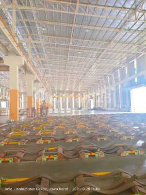 Warehouse for rent in Deltamas, Cikarang Land area 1.5 hectares Building area 7,656 m² Warehouse dimensions = 116 m x 66 m = 7,656 m² Ceiling height 10-12 m Floor load capacity 5 tons Electricity 240 Kva 6 warehouse doors 2 loading docks Suitable for production *Rent per m² IDR 90,000 excluding VAT and deposit* Ready Other warehouse available with Crane Area 3,000 m² Crane capacity 30 tons Electricity 240 Kva Price IDR 150,000/m²/month FrimelS