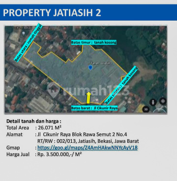 LAND CONDITION: - Flat land - Very strategic location near Jatiasih Toll Road ----------- UNIT SPECIFICATIONS: Land Area: 26,071 m² CERTIFICATE: SHGB (Right to Build) PRICE: Rp 3.5 million / m² (Negotiable) ---------- PAYMENT METHOD: CASH ----------- Johan Hutapea 08387530xxxx