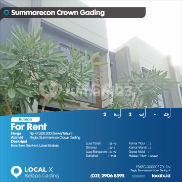 Brand New, Move-In Ready, Strategic Location For Rent Regia House, Summarecon Crown Gading Price: Rp 4,750,000/year Property Description: Brand New, Move-In Ready, Strategic Location Land Area: 55 m² Dimensions: 5x11 Building Area: 50 m² Certificate: PPJB Bedrooms: 2 Bathrooms: 2 Car Garage: - Orientation/View: South LOCAL X Kelapa Gading ******** 021 2906 8xxx P3KPG-0000xxxx-RN-S