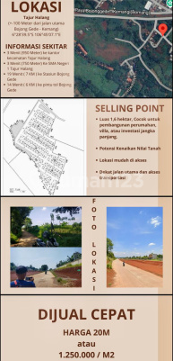 For sale: strategically located land spanning approximately 1.6 hectares in the Tajur Halang area, Bogor. With favorable land characteristics and a premium surrounding environment, this land is highly suitable for residential development, resorts, villas, or land banking. Ideal for: - Large-scale housing / clusters - Warehouses / light industry (subject to zoning regulations) - Islamic boarding schools (pesantren) - And more Location Advantages: - Rapidly developing Bogor area - Cool air & green surroundings - Adequate road access - Proximity to residential areas & supporting facilities - High potential for land value appreciation Specifications: - Land area: ± 16,000 m² (1.6 Ha) - Contour: relatively flat - Legality: 3 SHM under 1 Name (Secure & Clear) - Access: large vehicles can enter Competitive price for large land - Rp 1,250,000 / m² (NEGOTIABLE). Direct owner access - complete & transparent data. Survey by appointment only. Price negotiable - serious buyers only.