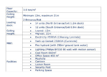 The warehouse is located within the Delta Silicon industrial area with an Industrial and Warehouse PBG (Building Permit). The warehouse is in good condition and ready for occupancy. It is equipped with a loading dock to facilitate loading and unloading processes. The high ceiling, integrated with the office area on the second floor, allows the space to be used not only for storage or warehousing but also for production and assembly activities. The industrial area offers a relatively safe environment for all production and business activities. It is flood-free, close to large factories and commercial areas, with relatively good road conditions and proximity to toll gate #243772.