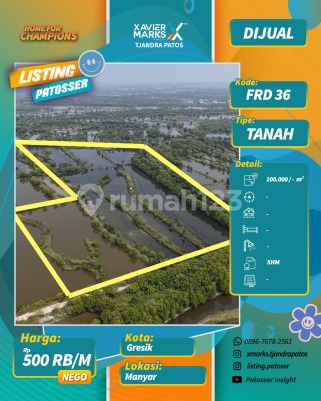 Betoyo Manyar Gresik Fishpond Land Warehousing and Industrial Area 800 meters from Daendles Main Road Approximately 15 minutes from Manyar Toll Land 10 Hectares (can be extended to +20 Hectares) SHM Certificate (Freehold Title) Investment 550 thousand/m2 Site Survey --> 081234540xxx Fredy Xmarks Tjandra Patos