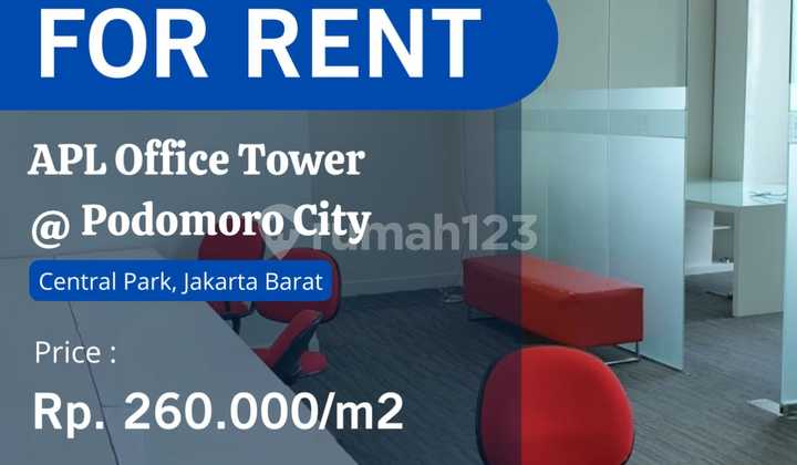 **APL Office Tower For Rent – Furnished and Renovated – Mid Floor** **Office Building Name:** APL Office Tower @ Podomoro City **Location:** CENTRAL PARK **Floor/View:** 20+/City View **Size:** 143 m² **Meeting Rooms:** 3 **Directors’ Rooms:** 2 **Condition:** Furnished **Electricity:** 100,000 watt **Rent Price:** IDR 260K/m² (Negotiable) **Service Charge Price:** IDR 61K/m² **NO OVERTIME** [View Video](https://youtu.be/sfRz7BGgoOo?si=l01CSgkg_p0yKBbq) **For More Info, please call or WhatsApp:** **HENOVPRO** **MEMBER AREBI** ■ **DWI** – 0817 0063 xxx □ **HENRY** – 0858 1999 8xxx **.hidownhenovpro** **Condition:** Semi-Furnished **Other Units Available:** - Fitted - Fully Lux Furnished (complete with meeting rooms, workstations, sofas, carpets, phone connections, intercom, ready to use) **Facilities:** Grade A Office Tower, Helipad, Integrated connection to Central Park Mall and Neo Soho Mall. **Additional Info:** APL Tower is one of the prestigious Grade A offices located in the Podomoro City area, surrounded by various facilities and available in multiple sizes. Podomoro City is the only prestigious superblock in West Jakarta. This superblock follows a Mixed-Use Development concept, featuring 7 apartment blocks, surrounded by malls, office towers, shop houses (ruko), schools, universities, hospitals, public transportation, and most importantly, a highly strategic location with access to the airport toll road, Pluit, PIK, Gading, Tangerang, Merak, Serang, Senayan, Port of Priok, etc. *Don’t hesitate to contact me directly.* *Other units of different sizes are available.*