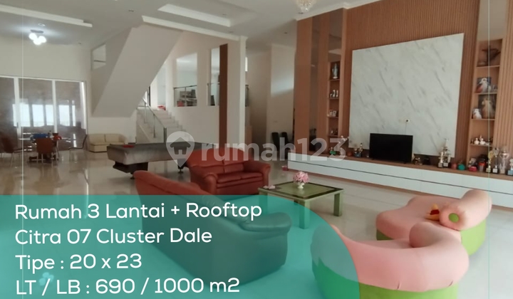 For Sale Citra 7 House Dale Cluster Number of floors: 3 + rooftop Type: 20 x 23 Land Area / Building Area: 690 / 1000 m2 Bedrooms: 5 Bathrooms: 5 First floor ceiling height: 7 meters Home theater/karaoke room: 1 Library room: 1 Fitness room: 1 Laundry room: 1 AC: 12 units Semi Furnished Garage: 3 cars Carport: 7 cars Has Lift Facing North Freehold Title Price: Rp 23 Billion Negotiable