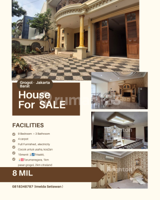 FOR SALE - 2.5-STORY LUXURY HOUSE GROGOL Jl. Susilo - Premium & Strategic Location Price: Rp 7.5 Billion SHM (Certificate of Ownership) SPECIFICATIONS ▪ Land Area: 276 m² (12 x 23) ▪ Building Area: ±690 m² ▪ Building: 2.5 stories ▪ Bedrooms: 9 ▪ Bathrooms: 5 ▪ Orientation: East ▪ Water: Municipal Water ▪ Electricity: 3,500 watts 4,400 watts (2 meters) SPACIOUS PARKING v Carport for 2 cars v Garage for 4 cars v Front road fits 3 cars SUPER STRATEGIC LOCATION ♂️ 30-minute walk to Tarumanegara University ♀️ 25-minute walk to Trisakti University ️ 2 km to Citraland Mall ️ 3 km to Taman Anggrek Mall Near BCA, BNI, Mandiri banks, etc. 1 km to Grogol Market * ADVANTAGES v Move-in ready v Elegant classic style v Lively & developing neighborhood v Suitable for residence & boarding house v Easy access to campus & business centers Info & Site Survey: WA: 081834xxxx