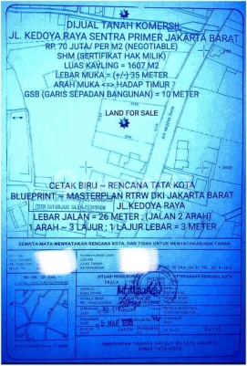 COMMERCIAL LAND FOR SALE.. !! Commercial Land on Jl. Kedoya Raya, Sentra Primer, West Jakarta. # Land specifications and relevant information details: # Plot Size approximately 35 x 53 M² ♧ Total Land Area = 1607 M² ♡ Front Width: (-/+) 35 Meters. ♢ Front Direction: Facing East. ♤ Land Status: Clear and Clean. ● Ownership Documents: 2 (two) SHM (Certificate of Ownership) Land area each (left and right); 795 M2 and 812 M2. ● GSB (Building Setback Line): 10 meters. # Road infrastructure and inter-connectivity road access according to the city planning in the masterplan blueprint of RTRW West Jakarta: # Road Width L = 26 meters # 2 Directions ~ 6 Lanes # 1 Lane L = 3 meters # Sidewalk L = 2 meters # Road Separator L = 2 meters # Drainage L = 1 meter # Road widening is estimated to be realized soon from the Metro TV Kedoya building to the Pesing~Tubagus Angke intersection. # Direct access connectivity to (main) ARTERIAL and TOLL roads. # Jalan Kedoya Raya will later be directly connected at both ends/ or flanked by 2 (Main) "Arterial" Roads: # Direct access to all TOLL Roads: # Airport TOLL. # JORR W1 and W2 TOLL. # Kebun Jeruk TOLL (Jakarta - Merak) # Inner City TOLL. # The location and position of the plot is very Unique and special with prospects as SCBD, the golden triangle of West Jakarta. # Access to public transportation network and 2 gas stations: Shell and Pertamina. # Strategic and multi-access: # Close to the airport. # SCBD ~ business center & city center # Premium ~ prestigious location and surroundings with a radius of elite super luxury residential areas. # Flood-free. Price: Rp 43 million / m² note: price may change at any time #mei/djja