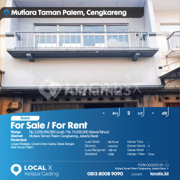 Strategic Location, Ideal for Business, Close to Taman Palem Mall For Sale / For Rent - Sale / Lease Mutiara Taman Palem Shop House, Cengkareng, West Jakarta Price: Rp 220,000,000 (Sale) / Rp 7,500,000 (Annual Lease) Property Description: Strategic Location, Ideal for Business, Close to Taman Palem Mall Land Area: 69.75 m2 Dimensions: 4.5x15.5 Building Area: 168 m2 Certificate: HGB Bedrooms: - Bathrooms: 2 Car Garage: - Facing / View: East LOCAL X Kelapa Gading ******** 081380089xxx P3PIK-0000xxxx-CI-J/S