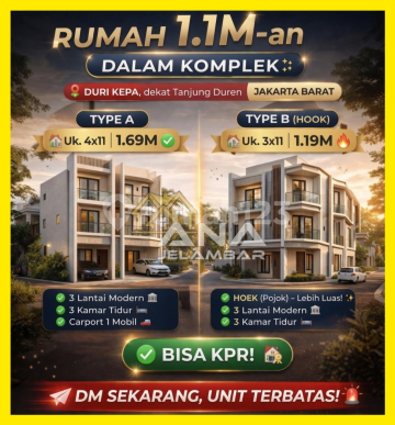 FOR SALE NEW 3-STORY HOUSE 3X11M MODERN MINIMALIST IN DURI KEPA, TANJUNG DUREN KEBON JERUK [CONTACT *ANA 08521505xxxx FAST RESPONSE VIA WA ^_^] #FINDHOUSEFINDANA# *PROFESSIONAL, EXPERIENCED, TRUSTED, PROVEN AND THE BEST !! - NEW 3-STORY HOUSE IN DURI KEPA, TANJUNG DUREN KEBON JERUK WEST JAKARTA CERTIFICATE OF OWNERSHIP Exclusive Cluster, One Gate System Quiet & Strategic Environment Easy Access to City Center Size 4x11M2 | 3 stories | 3BR | price 1.69M Size 3x11M2 | 3 stories | 3BR | price 1.19M ROAD WIDTH FOR 2 CARS Limited Units! Negotiable Price, Mortgage Assistance Available INFORMATION AND SURVEY : ANA FAST RESPONSE VIA WA *Check Video on Tiktok: anajelambar FOLLOW MY INSTAGRAM : anajelambar FOR UPDATE LISTING (HOT listing, market price, best price, and best location) #ANA your best property advisor#