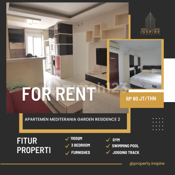 Mediterania Garden Residence 2 Apartment 3BR - For Rent Type: 3 BR+ Size: 110 Sqm Rent price: Rp 80 million/year Condition: Furnished Facilities: * Jogging Track * GYM Area * Swimming Pool Nearby Malls: * Taman Anggrek Mall * Central Park Mall * Neo Soho Mall * Citraland Mall Nearby Schools/Universities: * SMAK 1 BPK Penabur * Podomoro University * UKRIDA University * UNTAR University * Trisakti University * Binus University * etc