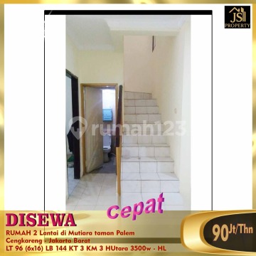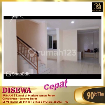 FOR RENT 2-Story House in Mutiara Taman Palem Cengkareng - West Jakarta Land Area 96 m² Dimensions 6 x 16 m² Building Area 144 m² (2 Floors) 3 Bedrooms 2 Bathrooms + 1 Unfurnished Electricity 3,500Watt WTP Water SHM Certificate North Facing Wide Road (3 cars wide) Facilities: 3 AC Units Bore Well Water Price: 90M/Year (Negotiable)