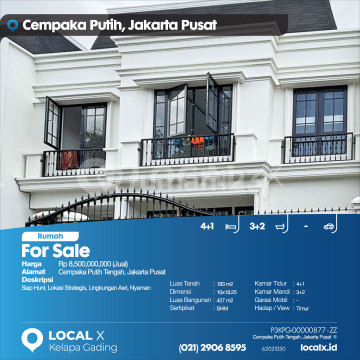 Ready to Occupy, Strategic Location, Beautiful Environment, Comfortable For Sale Cempaka Putih Tengah House, Central Jakarta Price: Rp 850000xxxx (For Sale) Property Description: Ready to Occupy, Strategic Location, Beautiful Environment, Comfortable Land Area: 183 m2 Dimensions: 10x18.25 Building Area: 427 m2 Certificate: SHM (Certificate of Ownership) Bedrooms: 4+1 Bathrooms: 3+2 Car Garage: - Facing/View: East LOCAL X Kelapa Gading ******** 021 2906 8xxx P3KPG-0000xxxx-ZZ-J