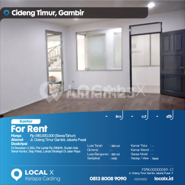 For Rent - Office Space Jl. Cideng Timur, Gambir, Central Jakarta Price: Rp 580,000,000 (Rent/Year) Property Description: Floors 2 & 3 for Rent, Rp 290 million per floor/year, Office Partitions Already Installed, Ready to Use, Strategic Location on Main Road Land Area: 300 m2 Dimensions: - Building Area: 300 m2 Certificate: HGB Bedrooms: - Bathrooms: - Car Garage: - Direction/View: West LOCAL X Kelapa Gading ******** ⓪⑧①③⑧⓪⓪⑧⑨⓪⑨⓪ P3PIK-0000xxxx-CI-S