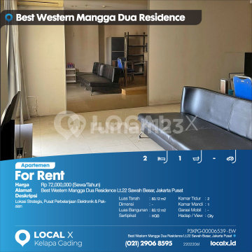 Strategic Location, Electronics & Clothing Shopping Center For Rent - Leasing Best Western Mangga Dua Residence Apartment 22nd Floor Sawah Besar, Central Jakarta Price: Rp 72,000,000 (Lease/Year) Property Description: Strategic Location, Electronics & Clothing Shopping Center Land Area: 83.12 m2 Dimensions: - Building Area: 83.12 m2 Certificate: HGB Bedrooms: 2 Bathrooms: 1 Car Garage: - Orientation/View: City LOCAL X Kelapa Gading ******** 021 2906 8xxx P3KPG-0000xxxx-EW-S