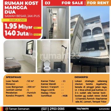 TSI/16675 For Sale / For Rent Mangga Dua Boarding House, Central Jakarta, 52 m², 4 Floors, HGB Price Rp 1,950,000,000 (Buy) / Rp 140,000,000 /yr (Rent) Address Sawah Besar, Central Jakarta Property Description Strategic location opposite Jayakarta train station, situated along the main road. The 1st floor is suitable for food business, while the 2nd-4th floors already have renovated boarding rooms (total 11 rooms). Furnished: each room includes AC, wardrobe, and bed. Land Area 52 m² Dimensions - Building Area 208 m² Number of Floors 4 Furnishing Furnished Condition Good Bedrooms 11 Bathrooms - Garage / Carport - Phone Line - Electricity Capacity - Facing / View - Certificate HGB LJH Realty Taman Semanan Property Help ✆ 021 2903 0xxx