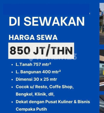 For Rent Commercial Building/Land in a Strategic Location on Cempaka Putih Main Road, Central Jakarta. Previously used as a workshop. SPECIFICATIONS: Land Area 757 m2 Dimensions 30 x 25 m Building Area 400 m2 Suitable for Restaurant, Coffee Shop, Workshop, Clinic, etc. Close to Culinary & Business Center Cempaka Putih Located by the main road. Price 850 Million negotiable #226863