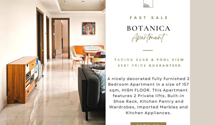 AVAILABLE FOR SALE BOTANICA APARTMENT Jl.Sultan Iskandar Muda No. 8 Kebayoran Lama, South Jakarta Welcome to Botanica Apartments, where luxury meets practicality in this spacious 2-bedroom residence spanning 157 square meters. Elevate your living experience with the convenience of a private lift, ensuring seamless access to your home. Facing Pool & SCBD View - East (BEST VIEW) Selling Price: Rp.6,500,000,000,- Ready to move in! Also available: 2BR/2+1BR/3BR/3+1BR/COMBINED units for Rent/Sale at the best price. FOR MORE INQUIRY & PRIVATE SHOWING: (+62)819 18888 660