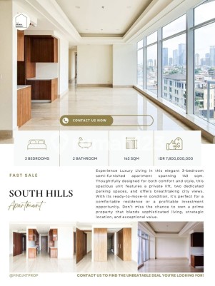 FAST SALE SOUTH HILLS KUNINGAN A beautifully designed 3-bedroom apartment at South Hills, one of Kuningan’s most sought-after residential towers. This spacious unit offers 145 sqm of well-planned living space, featuring a private lift, 2 dedicated parking spaces, and a comfortable layout that maximizes natural light and functionality—ideal for modern urban living. South Hills is known for its exclusive environment, premium facilities, and strategic location in the heart of Kuningan’s golden triangle. Residents enjoy close proximity to office buildings, lifestyle centers, international schools, and major roads, making it a convenient and comfortable home base in Jakarta. The building also offers resort-style amenities such as a large swimming pool, fitness center, sauna, yoga room, function room, children’s playground, and 24-hour security. This unit is offered at the best price currently available—a rare opportunity for homebuyers and investors alike. **Selling Price:** Before IDR 7,800,000,000,- Now IDR 7,300,000,000,- For more information or to arrange a private viewing, please contact Clara – Abie Property. I provide the most complete and updated listings, direct from owners, and will help you secure the best deal in the market. +6281918888xxx