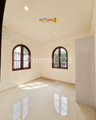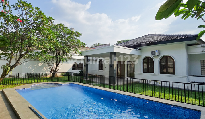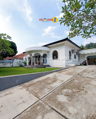 **House for Rent** Beautiful garden Large swimming pool and spacious veranda --- **Land:** 1000 sqm, **Building:** 500 sqm **4 bedrooms + 3 bathrooms + study room** **Electricity:** 16,500 watts **Maid's quarters:** 2 bedrooms + 1 bathroom **Garage:** 2 cars + **Carport:** 4 cars **Price:** IDR 725 million (negotiable, minimum 1-year lease, flood-free area)