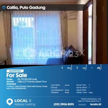 Furnished, Strategic Location, Near Transjakarta Busway Stop, Near Bella Terra Mall For Sale Callia Apartment 21st Floor, Pulomas, East Jakarta Price: Rp 70,000,xxx (For Sale) Property Description: Furnished, Strategic Location, Near Transjakarta Busway Stop, Near Bella Terra Mall Land Area: 43 m2 Dimensions: - Building Area: 43 m2 Certificate: PPJB Bedrooms: 1 Bathrooms: 1 Car Garage: - Facing/View: North LOCAL X Kelapa Gading ******** 021 2906 8xxx P3KPG-0000xxxx-EW-J