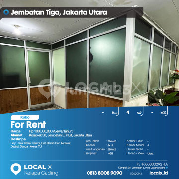 Ready to Use for Office, Clean and Well-Maintained Unit, Close to Toll Access For Rent - Lease Shop House Complex 38, Bridge 3, Pluit, North Jakarta Price: Rp 19,000,xxxx (Lease/Year) Property Description: Ready to Use for Office, Clean and Well-Maintained Unit, Close to Toll Access Land Area: 294 m2 Dimensions: 8x18 Building Area: 588 m2 Certificate: HGB (Right to Build) Bedrooms: - Bathrooms: 4 Car Garage: - Orientation/View: North LOCAL X Kelapa Gading ******** ⓪⑧①③⑧⓪⓪⑧⑨⓪⑨⓪ P3PIK-0000xxxx-LA-S