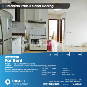 Furnished, Near Lotte Mart, Mitra Keluarga Gading Hospital, Close to Offices and Dining For Rent Paladian Park Apartment, Tower F 11th Floor Kelapa Gading, North Jakarta Price. Rp 65,000,000 (Rent/Year) Property Description. Furnished, Near Lotte Mart, Mitra Keluarga Gading Hospital, Close to Offices and Dining Land Area. 85 m2 Dimensions. - Building Area. 85 m2 Certificate. PPJB Bedrooms. 2 Bathrooms. 1 Car Garage. - Facing / View. City LOCAL X Kelapa Gading ******** ⓪②① ②⑨⓪⑥ ⑧⑤⑨⑤ P3KPG-0000xxxx-RN-S