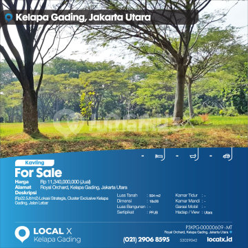 (Rp22.5 million/m2) Strategic Location, Exclusive Cluster Kelapa Gading, Wide Road For Sale Royal Orchard Plot of Land, Kelapa Gading, North Jakarta Price: Rp 11,340,000,000 (For Sale) Property Description: (Rp22.5 million/m2) Strategic Location, Exclusive Cluster Kelapa Gading, Wide Road Land Area: 504 m2 Dimensions: 18x28 Building Area: 504 m2 Certificate: PPJB Bedrooms: - Bathrooms: - Car Garage: - Orientation/View: North LOCAL X Kelapa Gading ******** 021 2906 8xxx Whatsapp/Call. Mariana - 0816 4830 xxx P3KPG-0000xxxx-MT-J