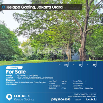 (Rp25 million/month) Strategic Location, Wide Road, Exclusive Cluster Kelapa Gading For Sale Land Plot Royal Orchard, Kelapa Gading, North Jakarta Price. Rp 13,500,000,000 (For Sale) Property Description. (Rp25 million/month) Strategic Location, Wide Road, Exclusive Cluster Kelapa Gading Land Area. 540 m2 Dimensions. 18x30 Building Area. 540 m2 Certificate. PPJB Bedrooms. - Bathrooms. - Car Garage. - Facing / View. South-West LOCAL X Kelapa Gading ******** 021 2906 8xxx Whatsapp/Call. Mariana - 0816 4830 xxx P3KPG-0000xxxx-JW&MT-J