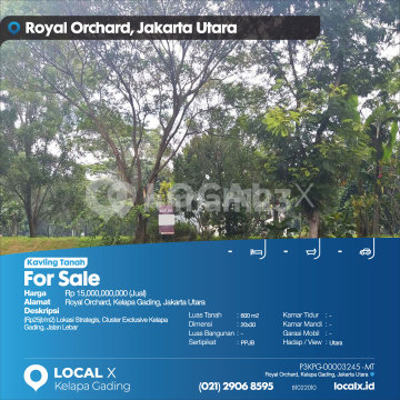 (Rp25 million/m2) Strategic Location, Exclusive Cluster in Kelapa Gading, Wide Road For Sale Land Plot at Royal Orchard, Kelapa Gading, North Jakarta Price. Rp 15,000,000,000 (For Sale) Property Description. (Rp25 million/m2) Strategic Location, Exclusive Cluster in Kelapa Gading, Wide Road Land Area. 600 m2 Dimensions. 20x30 Building Area. 600 m2 Certificate. PPJB (Agreement to Sell and Purchase) Bedrooms. - Bathrooms. - Car Garage. - Facing / View. North LOCAL X Kelapa Gading ******** 021 2906 8xxx Whatsapp/Call. Mariana - 0816 4830 xxx P3KPG-0000xxxx-MT-J