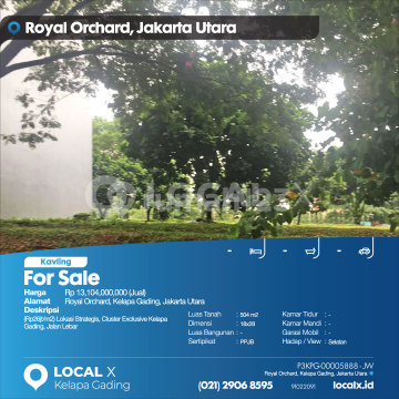 (Rp26 million/m2) Strategic Location, Exclusive Cluster in Kelapa Gading, Wide Road For Sale Royal Orchard Plot, Kelapa Gading, North Jakarta Price: Rp 13,104,000,000 (For Sale) Property Description: (Rp26 million/m2) Strategic Location, Exclusive Cluster in Kelapa Gading, Wide Road Land Area: 504 m2 Dimensions: 18x28 Building Area: 504 m2 Certificate: PPJB Bedrooms: - Bathrooms: - Car Garage: - Facing / View: South LOCAL X Kelapa Gading ******** 021 2906 8xxx Whatsapp/Call. Mariana - 0816 4830 xxx P3KPG-0000xxxx-JW-J