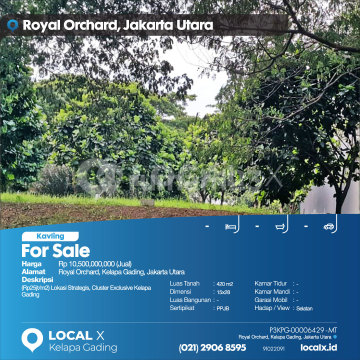 (Rp25 million/m2) Strategic Location, Exclusive Cluster in Kelapa Gading For Sale Land Plot in Royal Orchard, Kelapa Gading, North Jakarta Price: Rp 10,500,000,000 (For Sale) Property Description: (Rp25 million/m2) Strategic Location, Exclusive Cluster in Kelapa Gading Land Area: 420 m2 Dimensions: 15x28 Building Area: 420 m2 Certificate: PPJB (Sale and Purchase Agreement) Bedrooms: - Bathrooms: - Car Garage: - Facing/View: South LOCAL X Kelapa Gading ******** 021 2906 8xxx Whatsapp/Call. Mariana - 0816 4830 5xxx P3KPG-0000xxxx-MT-J