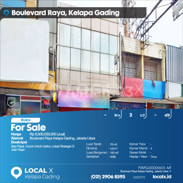 Ready to Use, Suitable for Business, Strategic Location on Main Road For Sale Ruko Boulevard Raya Kelapa Gading, North Jakarta Price: Rp 950,000,xxx (For Sale) Property Description: Ready to Use, Suitable for Business, Strategic Location on Main Road Land Area: 76 m² Dimensions: 4.5 x 17 Building Area: 150 m² Certificate: HGB Bedrooms: - Bathrooms: 2 Car Garage: - Facing/View: East LOCAL X Kelapa Gading ******** ⓪②① ②⑨⓪⑥ ⑧⑤⑨⑤ WhatsApp/Call: Mariana - ⓪⑧①⑥④⑧③⓪⑤⑤⓪ P3KPG-0000xxxx-MT-J