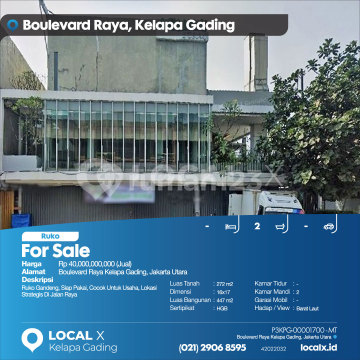 Row House, Ready to Use, Suitable for Business, Strategic Location on Main Road For Sale Row House on Boulevard Raya, Kelapa Gading, North Jakarta Price: Rp 4,000,000,xxx (For Sale) Property Description: Row House, Ready to Use, Suitable for Business, Strategic Location on Main Road Land Area: 272 m² Dimensions: 16x17 Building Area: 447 m² Certificate: HGB (Right to Build) Bedrooms: - Bathrooms: 2 Car Garage: - Orientation/View: Northwest LOCAL X Kelapa Gading ******** 021 2906 8xxx WhatsApp/Call: Mariana - 0816 4830 xxx P3KPG-0000xxxx-MT-J