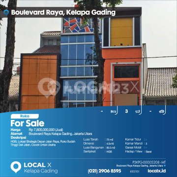 HGB, Strategically Located in Front of Main Road, Shop House Already Elevated from Road, Suitable for Business For Sale Boulevard Raya Shop House, Kelapa Gading, North Jakarta Price: Rp 780,000,xxx (For Sale) Property Description: HGB, Strategically Located in Front of Main Road, Shop House Already Elevated from Road, Suitable for Business Land Area: 72 m² Dimensions: 4.5x16 Building Area: 85.5 m² Certificate: HGB Bedrooms: - Bathrooms: 3 Car Garage: - Facing/View: West LOCAL X Kelapa Gading ******** 021-2906-8xxx Whatsapp/Call: Mariana - 0816-4830-xxx P3KPG-0000xxxx-MT-J