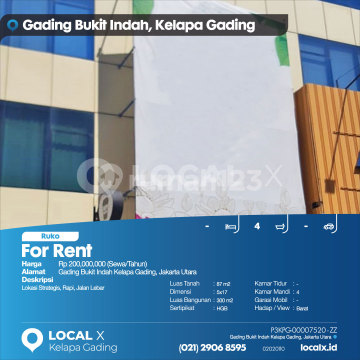 Strategic Location, Tidy, Wide Road For Rent Gading Bukit Indah Shop House, Kelapa Gading, North Jakarta Price: Rp 20,000,xxx (Rent/Year) Property Description: Strategic Location, Tidy, Wide Road Land Area: 87 m2 Dimensions: 5x17 Building Area: 300 m2 Certificate: HGB (Right to Build) Bedrooms: - Bathrooms: 4 Car Garage: - Facing / View: West LOCAL X Kelapa Gading ******** 021 2906 8xxx P3KPG-0000xxxx-ZZ-S