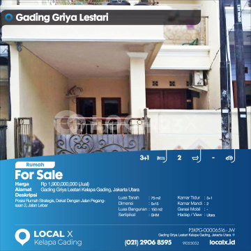 Strategic House Location, Close to Jalan Pegangsaan 2, Wide Road For Sale Gading Griya Lestari House, Kelapa Gading, North Jakarta Price: Rp 190,000,xxx (For Sale) Property Description: Strategic House Location, Close to Jalan Pegangsaan 2, Wide Road Land Area: 75 m² Dimensions: 5x15 Building Area: 150 m² Certificate: SHM Bedrooms: 3+1 Bathrooms: 2 Car Garage: - Facing / View: North LOCAL X Kelapa Gading ******** 021 2906 8xxx P3KPG-0000xxxx-JW-J