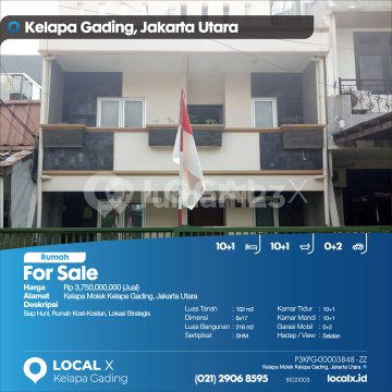 Ready to Occupy, Boarding House, Strategic Location For Sale House in Kelapa Molek, Kelapa Gading, North Jakarta Price: Rp 3,750,000,000 (For Sale) Property Description: Ready to Occupy, Boarding House, Strategic Location Land Area: 102 m2 Dimensions: 6x17 Building Area: 216 m2 Certificate: SHM Bedrooms: 10+1 Bathrooms: 10+1 Car Garage: 0+2 Orientation/View: South LOCAL X Kelapa Gading ******** 021 2906 8xxx P3KPG-0000xxxx-ZZ-J