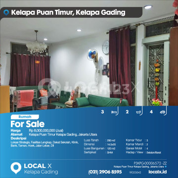 Strategic Location, Complete Facilities, Near Schools, Clinic, Bank, Park, Corner, Wide Road, etc. For Sale House in Kelapa Puan Timur, Kelapa Gading, North Jakarta Price: Rp 800,000,000 (For Sale) Property Description: Strategic Location, Complete Facilities, Near Schools, Clinic, Bank, Park, Corner, Wide Road, etc. Land Area: 290 m2 Dimensions: 14.5 x 20 Building Area: 120 m2 Certificate: SHM (Freehold Title) Bedrooms: 3 Bathrooms: 2 Car Garage: 4 Facing/View: South/West LOCAL X Kelapa Gading ******** 021 2906 8xxx P3KPG-0000xxxx-ZZ-J