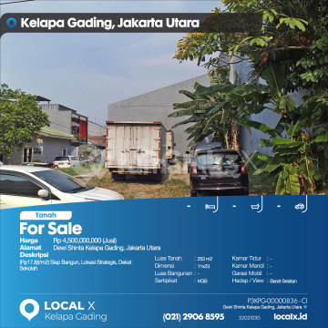 (Rp17.8 million/m2) Ready to Build, Strategic Location, Close to Schools For Sale Dewi Shinta Land, Kelapa Gading, North Jakarta Price: Rp 450,000,xxx (For Sale) Property Description: (Rp17.8 million/m2) Ready to Build, Strategic Location, Close to Schools Land Area: 253 m2 Dimensions: 11x23 Building Area: 253 m2 Certificate: HGB Bedrooms: - Bathrooms: - Car Garage: - Facing / View: West-South LOCAL X Kelapa Gading ******** 021 2906 8xxx P3KPG-0000xxxx-CI-J