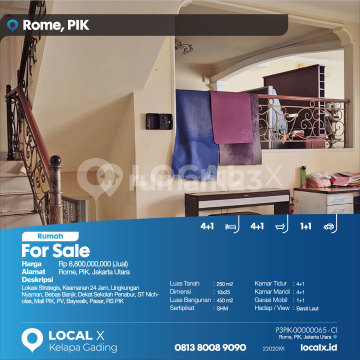 Strategic Location, 24-Hour Security, Comfortable Environment, Flood-Free, Close to Penabur School, ST Nicholas, PIK Mall, PV, Baywalk, Market, PIK Hospital For Sale Rome House, PIK, North Jakarta Price: Rp 880000xxxx (For Sale) Property Description: Strategic Location, 24-Hour Security, Comfortable Environment, Flood-Free, Close to Penabur School, ST Nicholas, PIK Mall, PV, Baywalk, Market, PIK Hospital Land Area: 250 m² Dimensions: 10x25 Building Area: 450 m² Certificate: SHM (Freehold Title) Bedrooms: 4+1 Bathrooms: 4+1 Car Garage: 1+1 Orientation/View: Northwest LOCAL X Kelapa Gading ******** ⓪⑧①③⑧⓪⓪⑧⑨⓪⑨⓪ P3PIK-0000xxxx-CI-J
