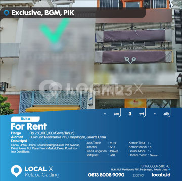 Suitable for Business, Strategic Location near PIK Avenue, Close to Toll Access, Fresh Market, Near Culinary and Business Centers For Rent - Leasing Mediterranean Golf Hill Shop House, PIK, Penjaringan, North Jakarta Price: Rp 25,000,xxx (Rent/Year) Property Description: Suitable for Business, Strategic Location near PIK Avenue, Close to Toll Access, Fresh Market, Near Culinary and Business Centers Land Area: 75 m2 Dimensions: 5x15 Building Area: 300 m2 Certificate: HGB (Right to Build) Bedrooms: - Bathrooms: 3 Car Garage: - Facing / View: South LOCAL X Kelapa Gading ******** ⓪⑧①③⑧⓪⓪⑧⑨⓪⑨⓪ P3PIK-0000xxxx-CI-S